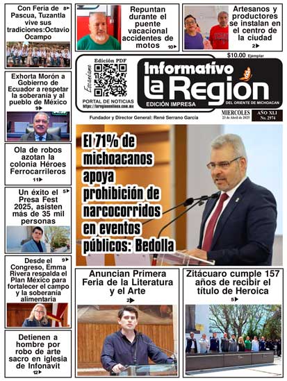 Lea SIN COSTO la Edición impresa digital del Periódico La Región No. 2974 Miércoles 23 de Abril de 2025 Noticias #Zitácuaro, #Michoacán, #Morelia