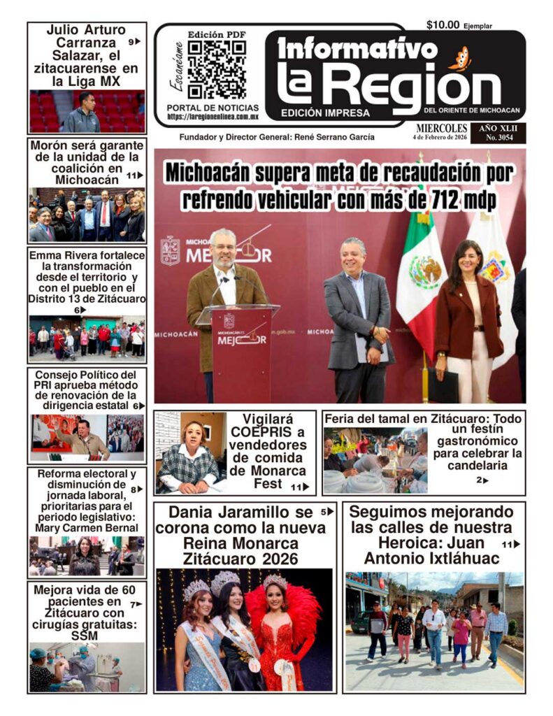 Lea SIN COSTO la Edición impresa digital del Periódico La Región No. 3054 – Miércoles 4 de Febrero de 2026 Noticias #Zitácuaro, #Michoacán, #Morelia.
