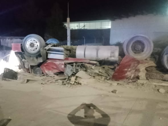 H. Zitácuaro, Michoacán, 19 de enero de 2026. – La mañana de este lunes se registró un accidente en la carretera Zitácuaro-Toluca, a la altura de la agencia Chevrolet, donde un tráiler que transportaba cemento volcó tras quedarse sin frenos e impactar contra una camioneta.